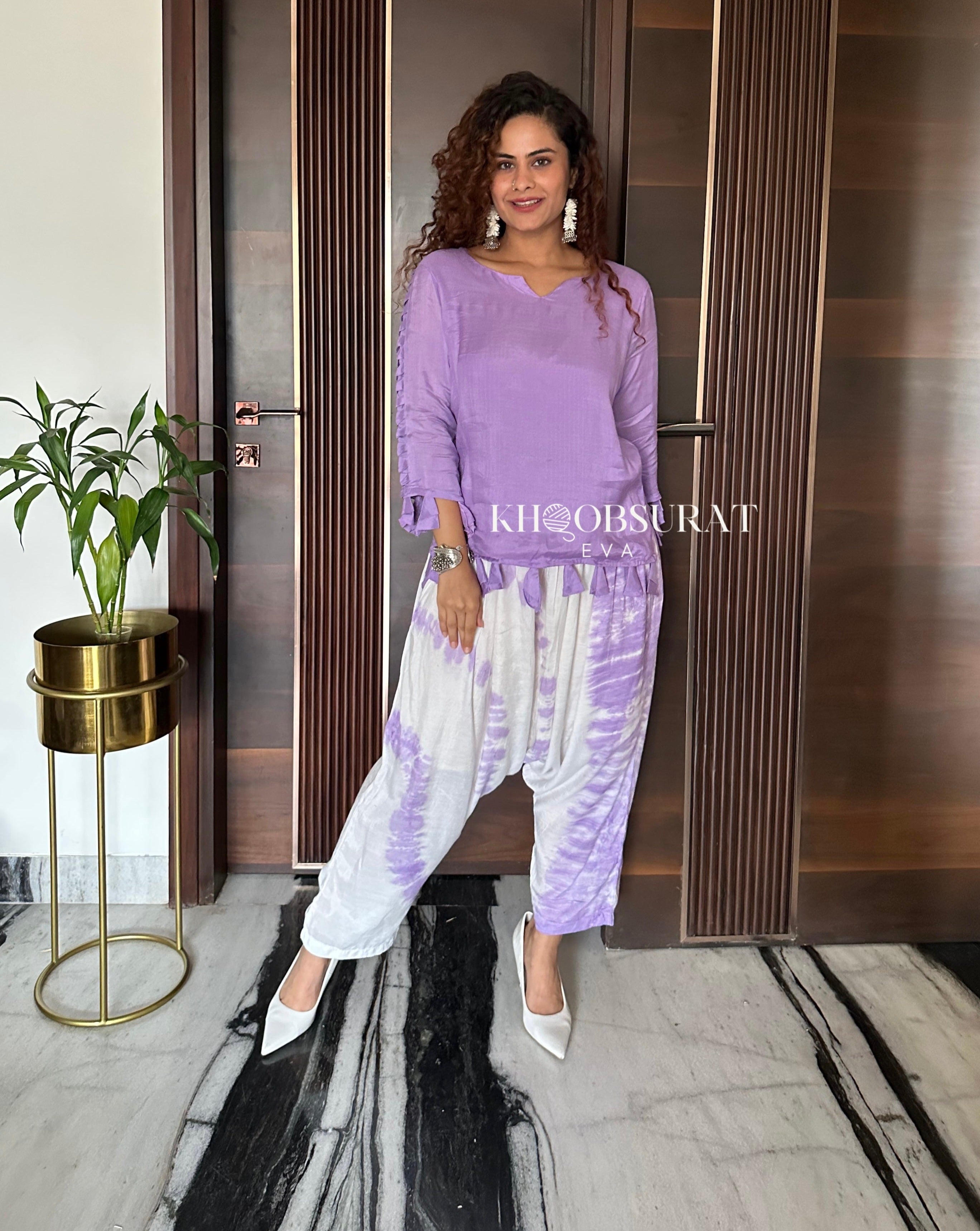 Have you spotted this new style? Airy Styles Purple Top With Tulip Pants! Crafted with airy muslin fabric, these marvels of comfort are here to take your fashionable look to the next level. Dare to be different with trendy tie-and-dye tulip pants that come with linning attached - perfect for making a fusion-fabulous statement!