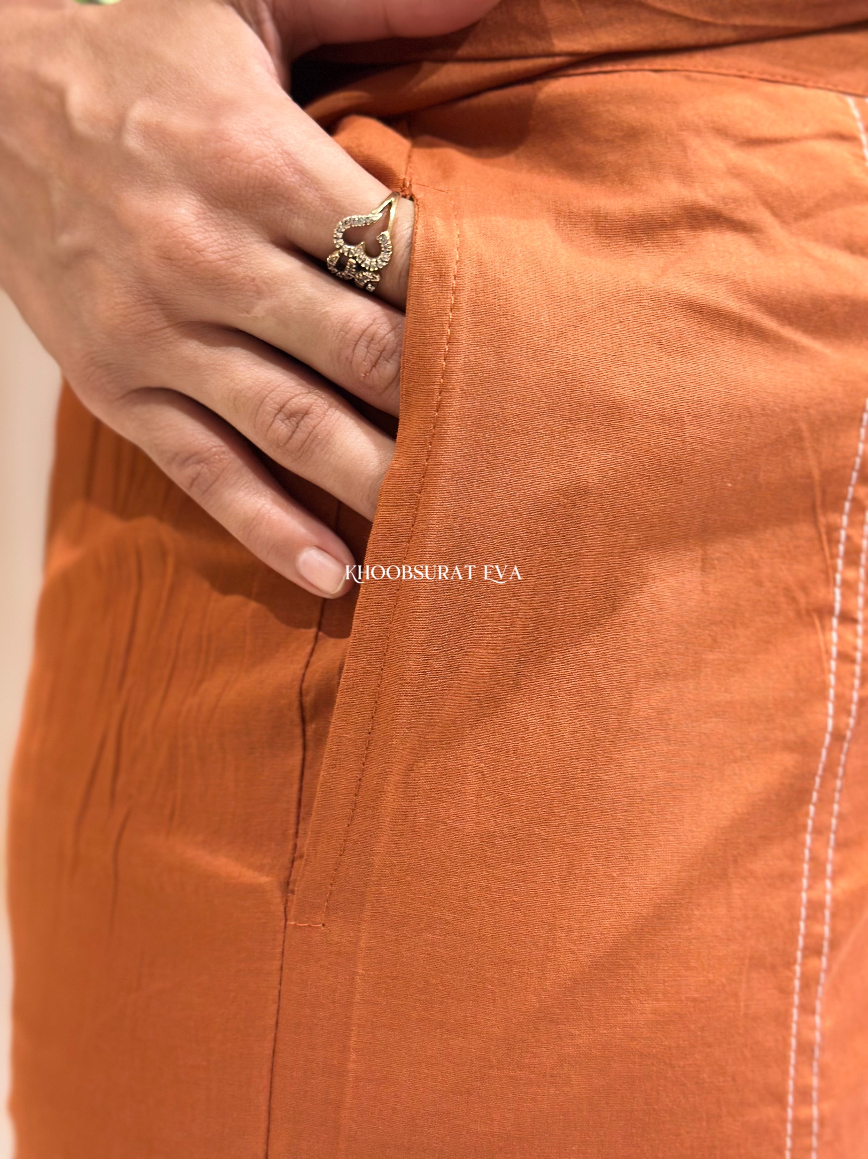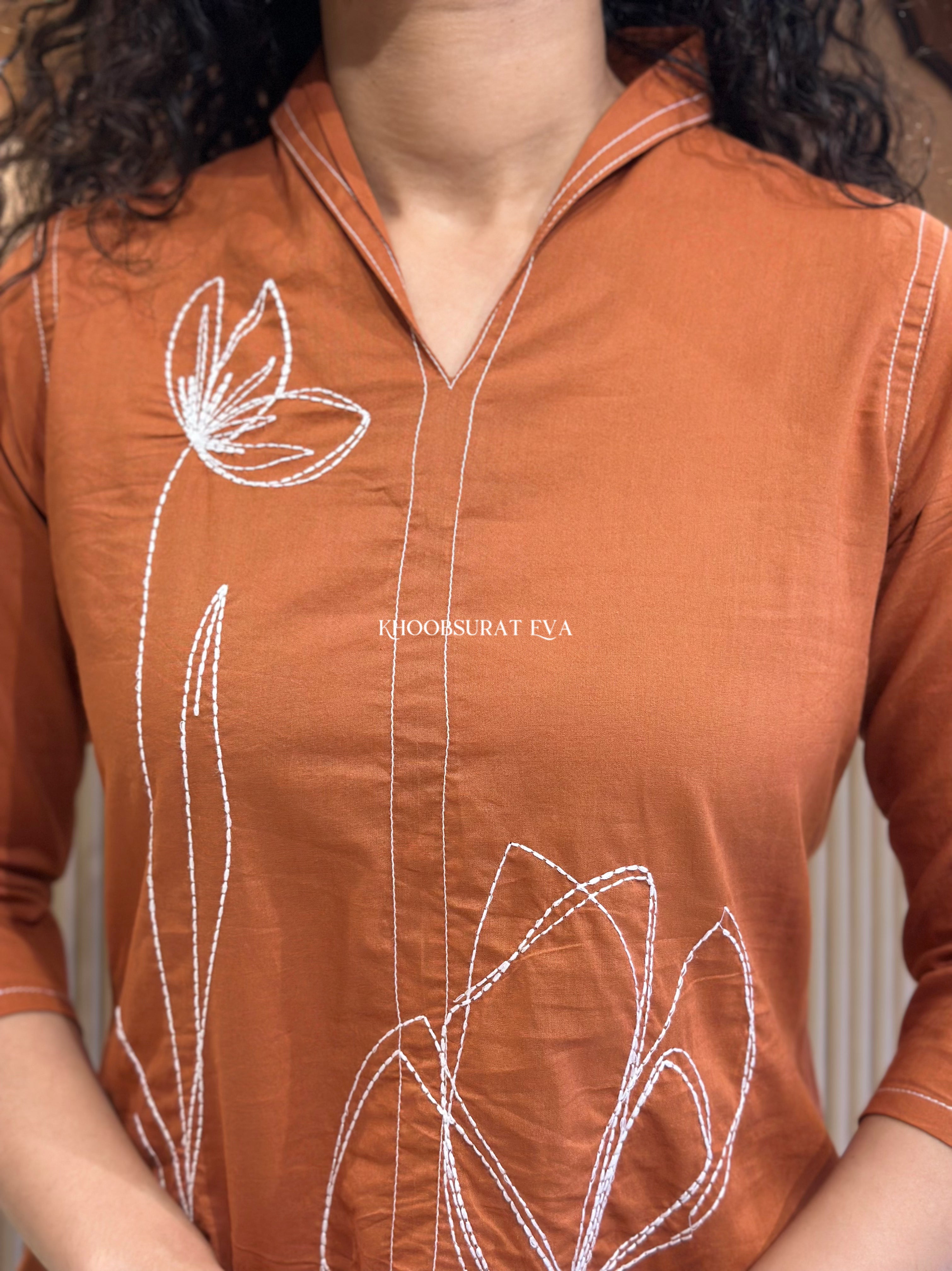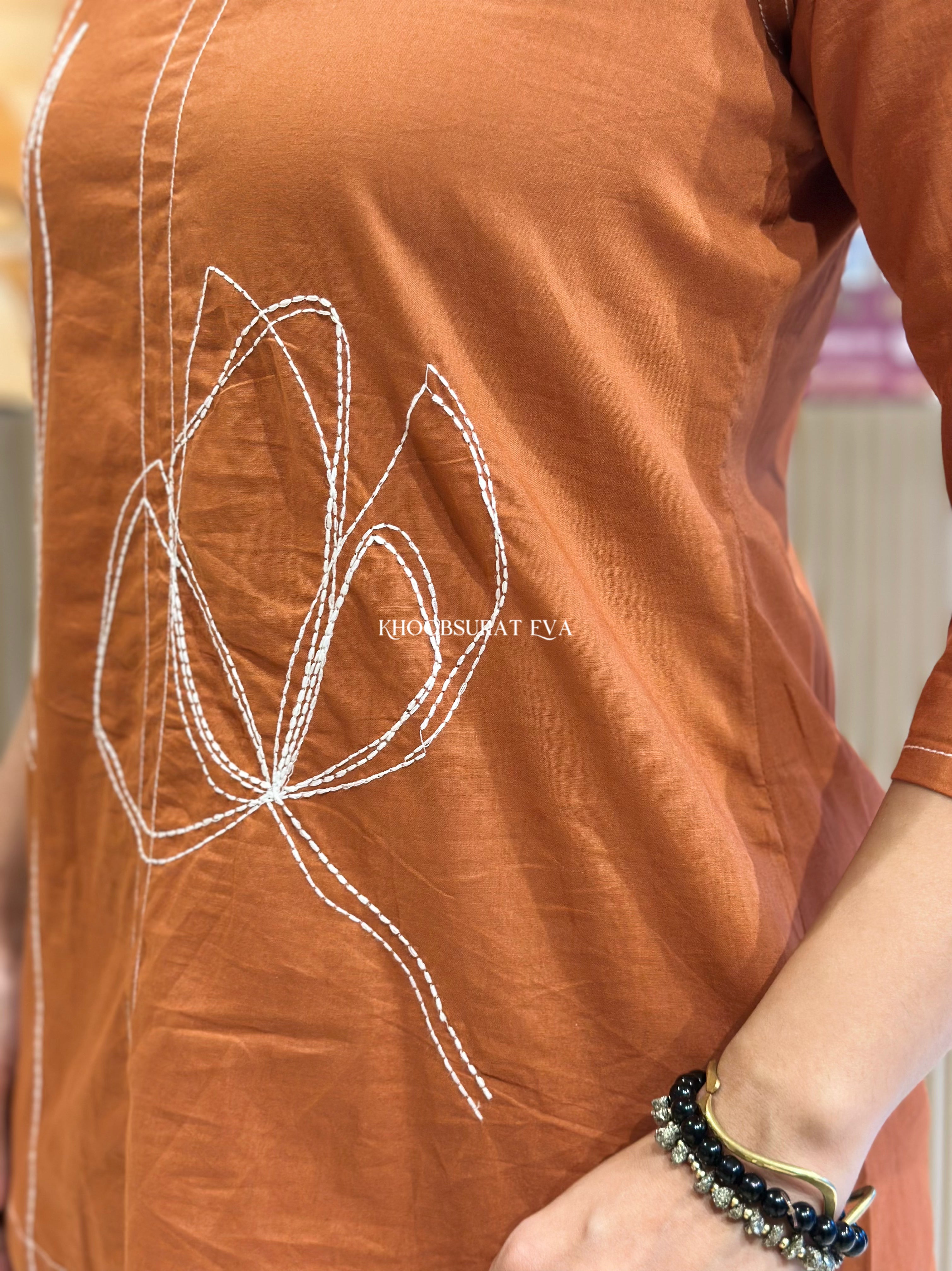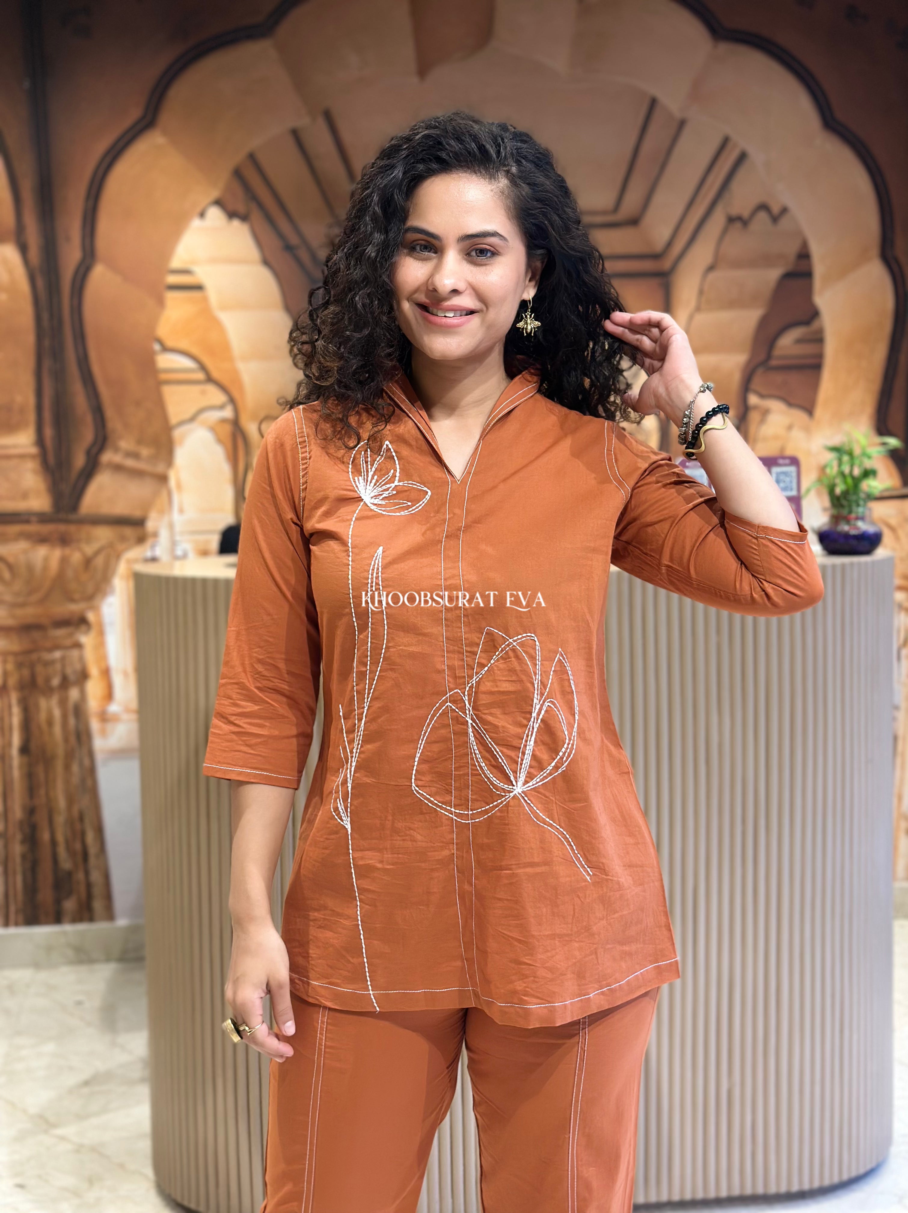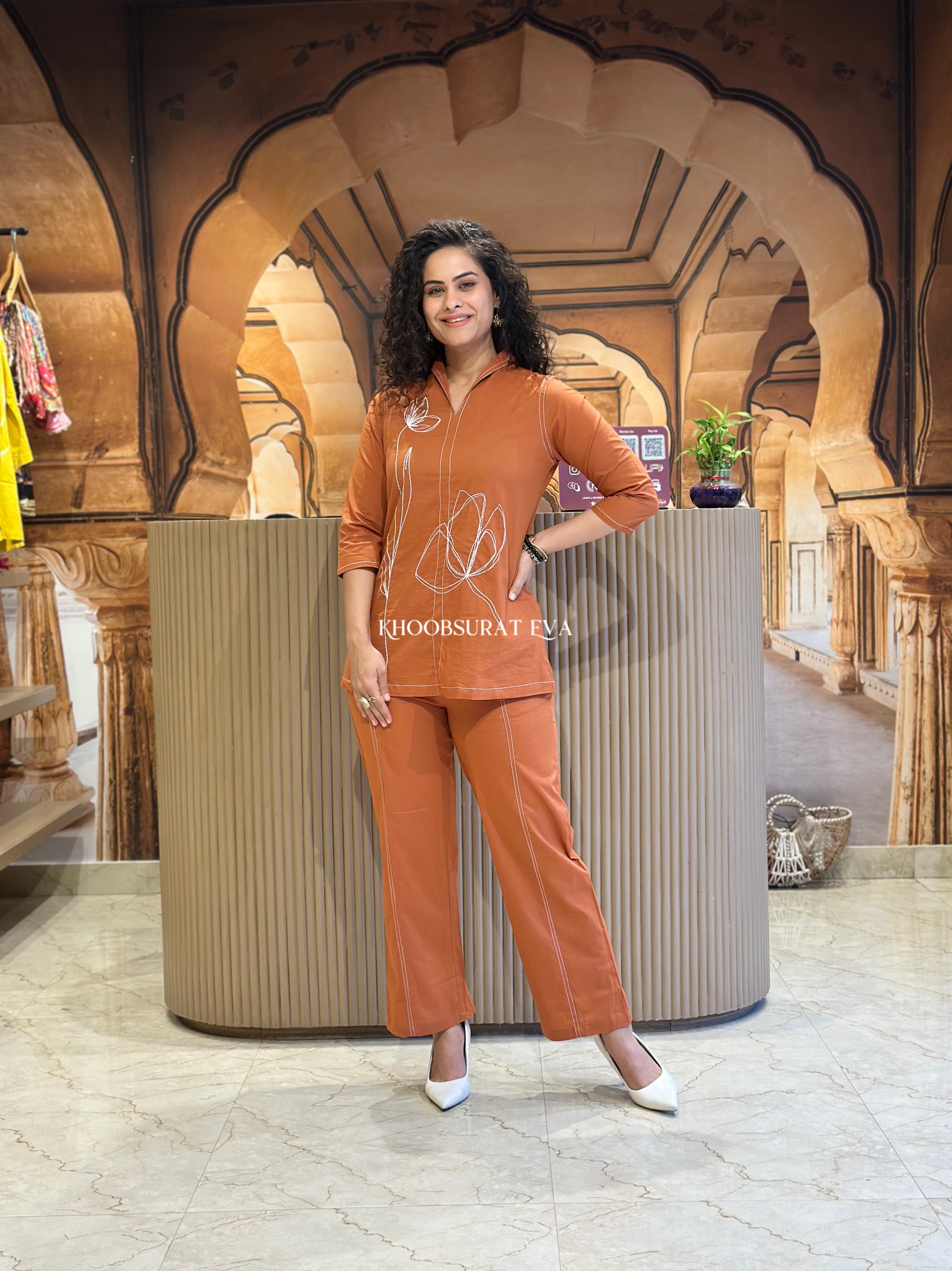 The Rust Orange Coord set offers a trending and comfortable pure cotton ensemble with floral embroidery, making it a flattering and versatile choice for office, college, and beyond, suitable for all ages and skin tones.