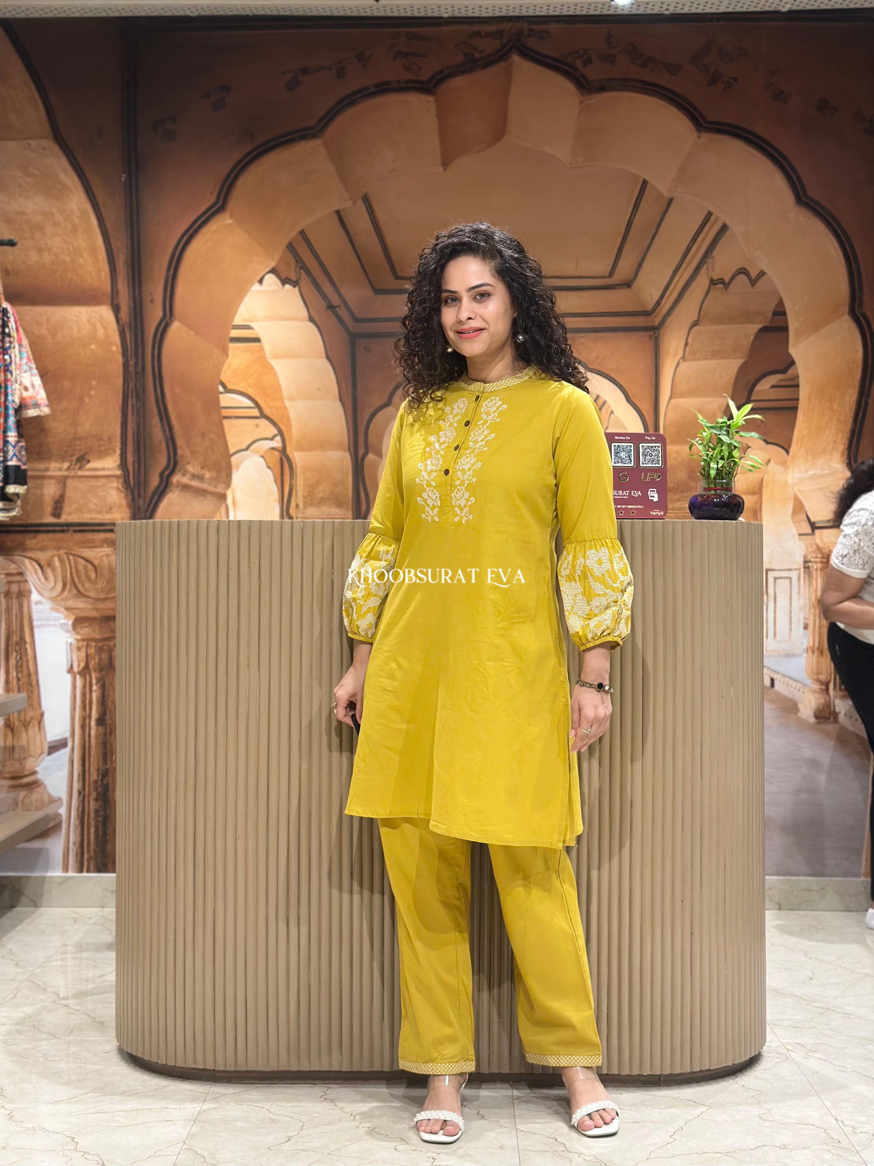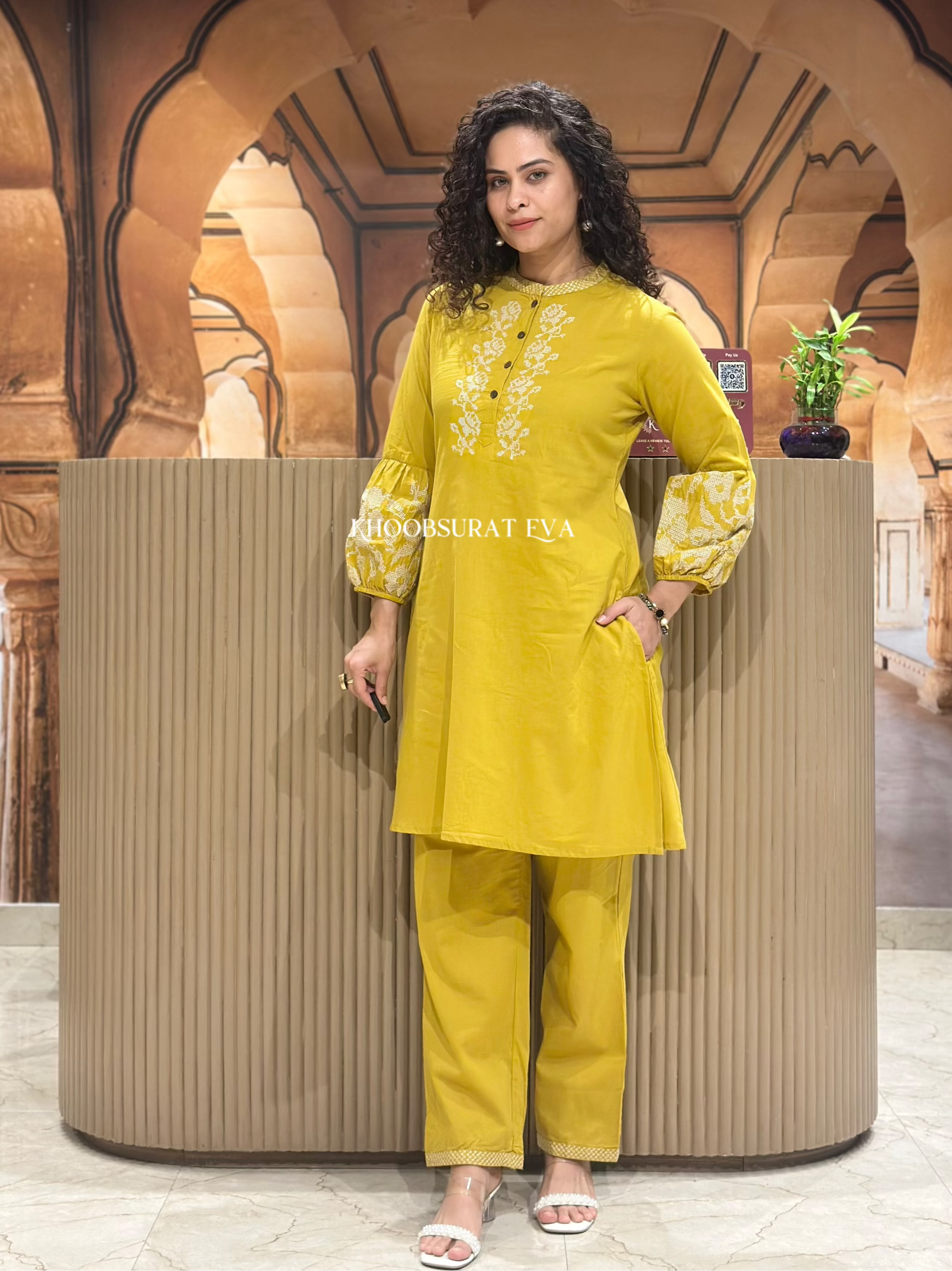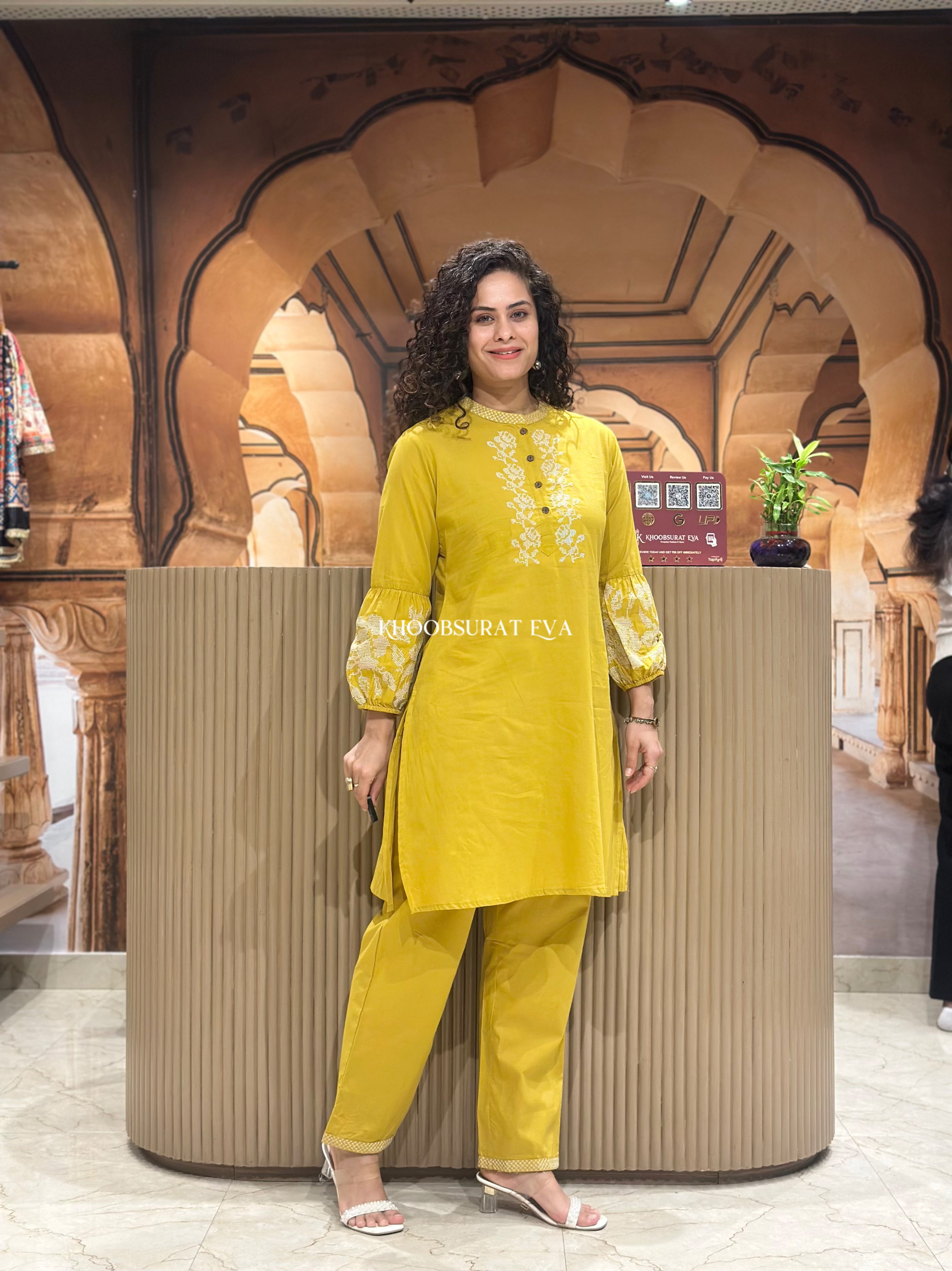 Discover the Summer Refresh Yellow Coord Set t from Khoobsurat Eva.A beautiful ensemble designed with every body in mind. Crafted from lightweight Cotton, this set features a Top with elegant 3/4 sleeves and a stylish mandarin neck. It's perfectly paired with comfortable printed muslin trousers. Experience the harmonious blend of artistry and a modern straight silhouette. This breezy and casual coord set is your ideal choice for staying stylish and comfortable on warm days or during a hectic workday.
