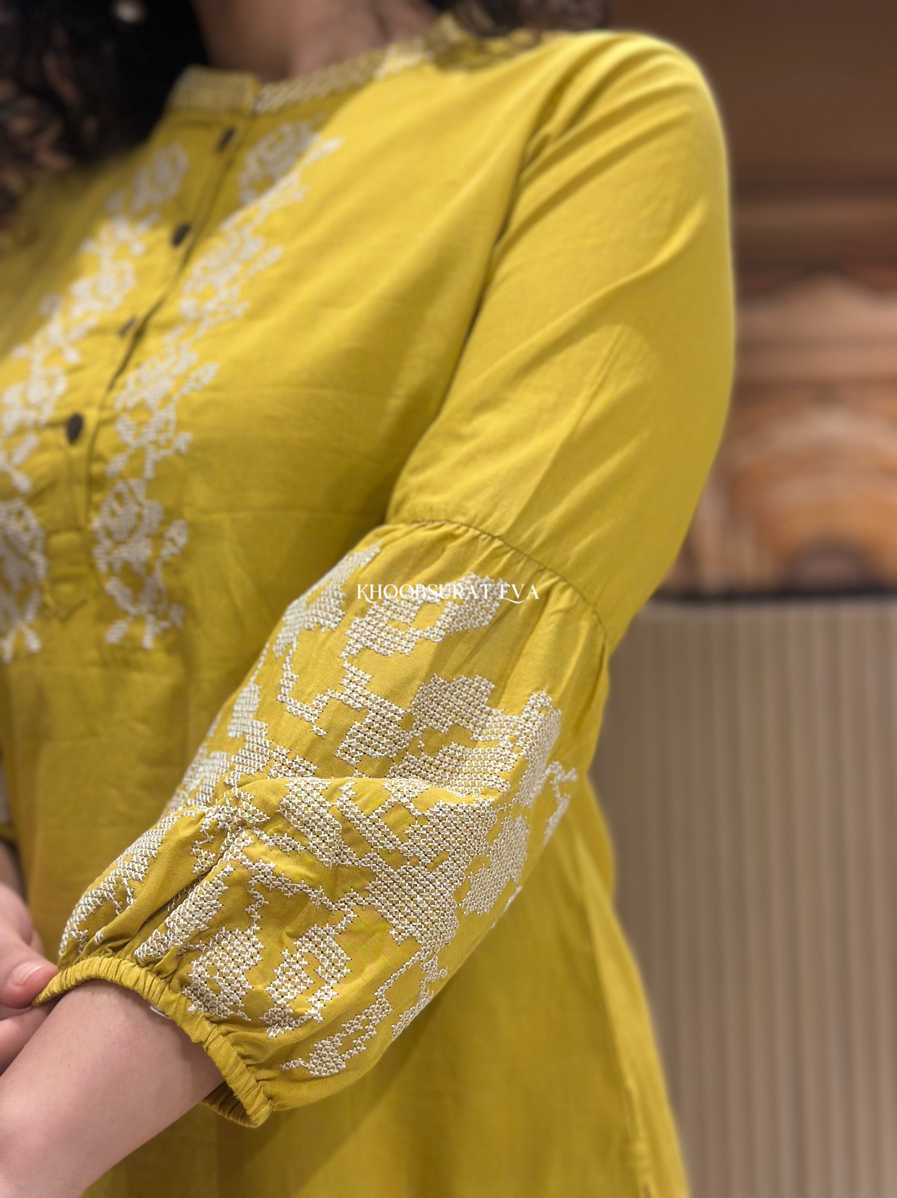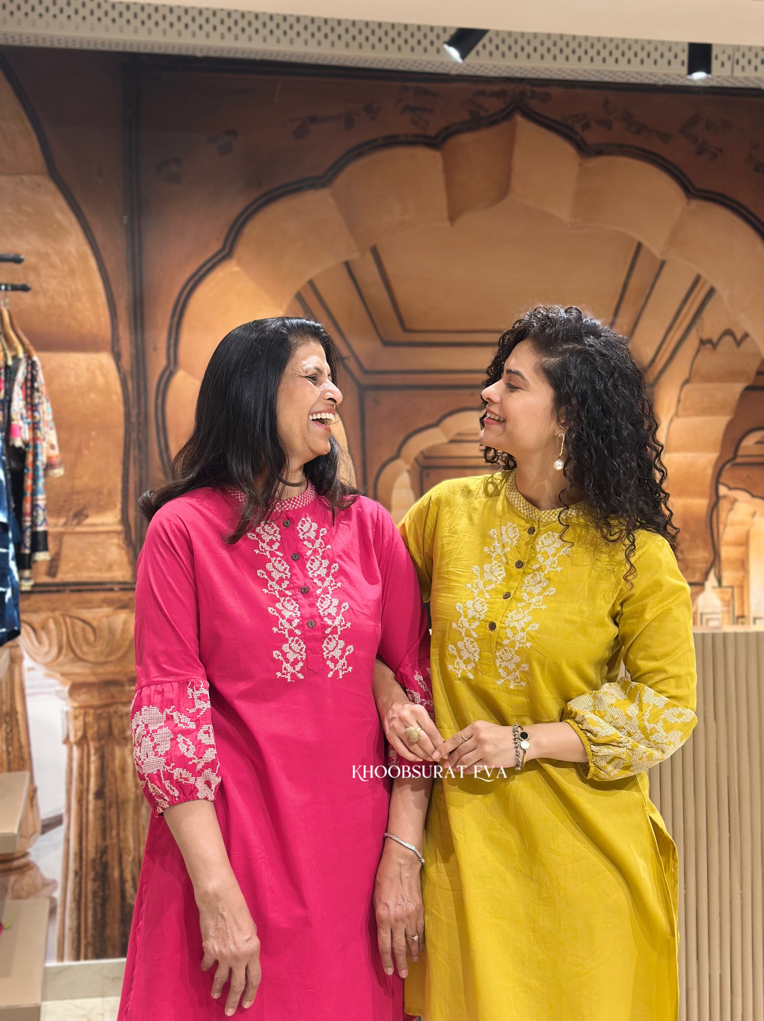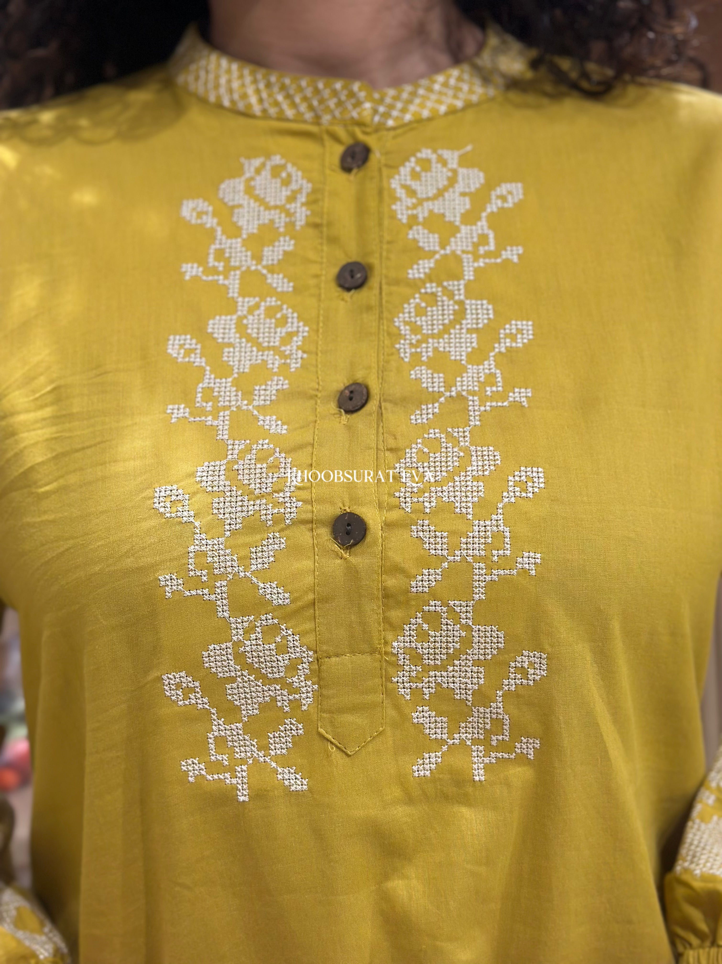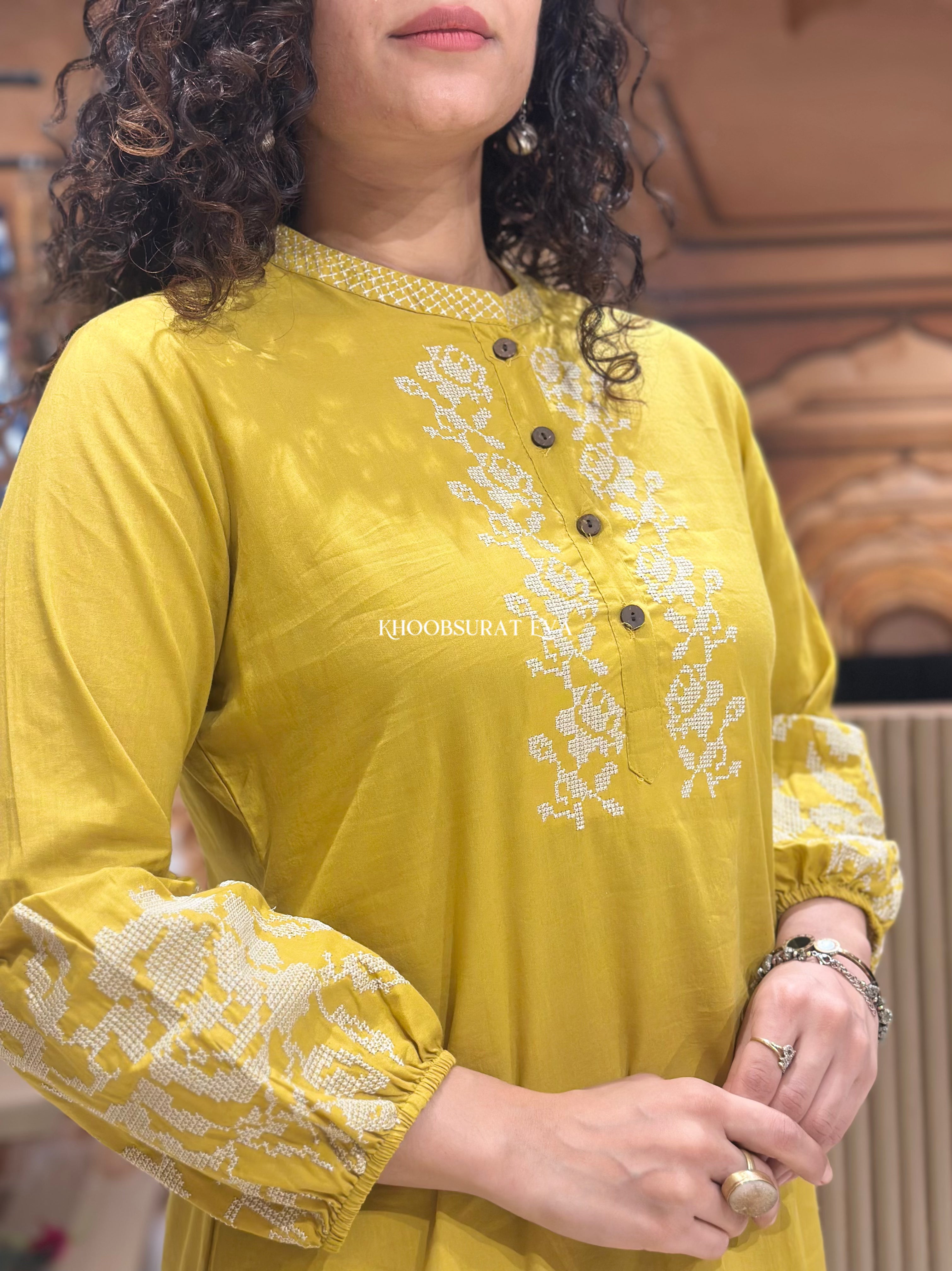 Discover the Summer Refresh Yellow Coord Set t from Khoobsurat Eva.A beautiful ensemble designed with every body in mind. Crafted from lightweight Cotton, this set features a Top with elegant 3/4 sleeves and a stylish mandarin neck. It's perfectly paired with comfortable printed muslin trousers. Experience the harmonious blend of artistry and a modern straight silhouette. This breezy and casual coord set is your ideal choice for staying stylish and comfortable on warm days or during a hectic workday.