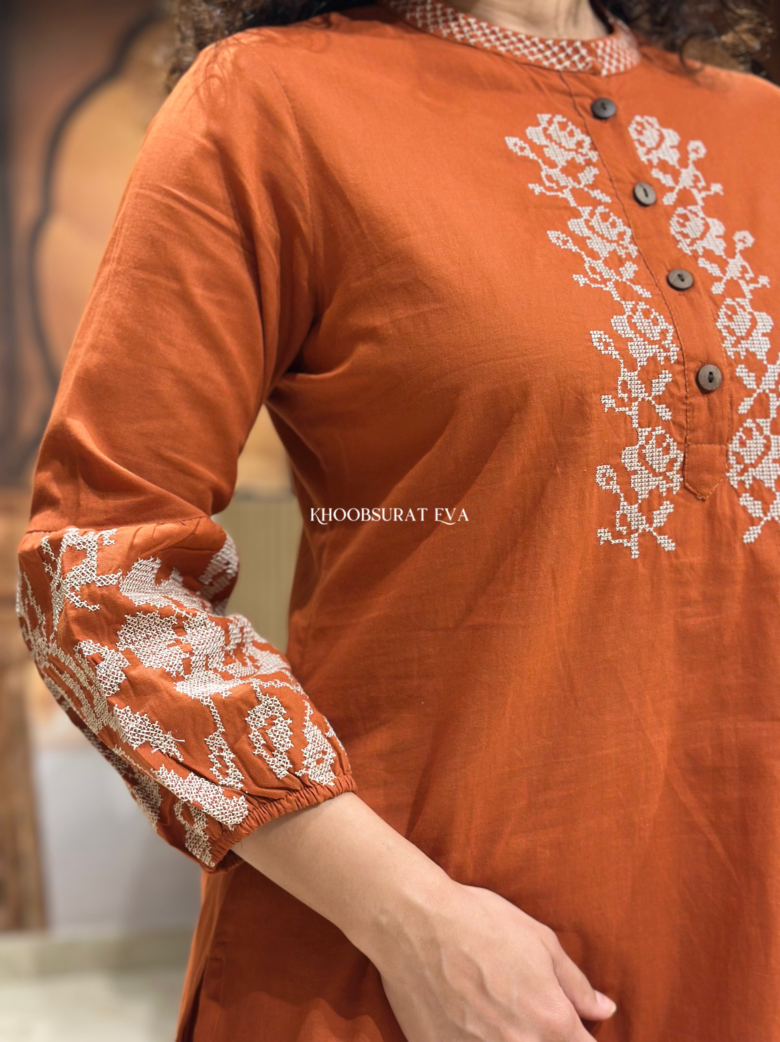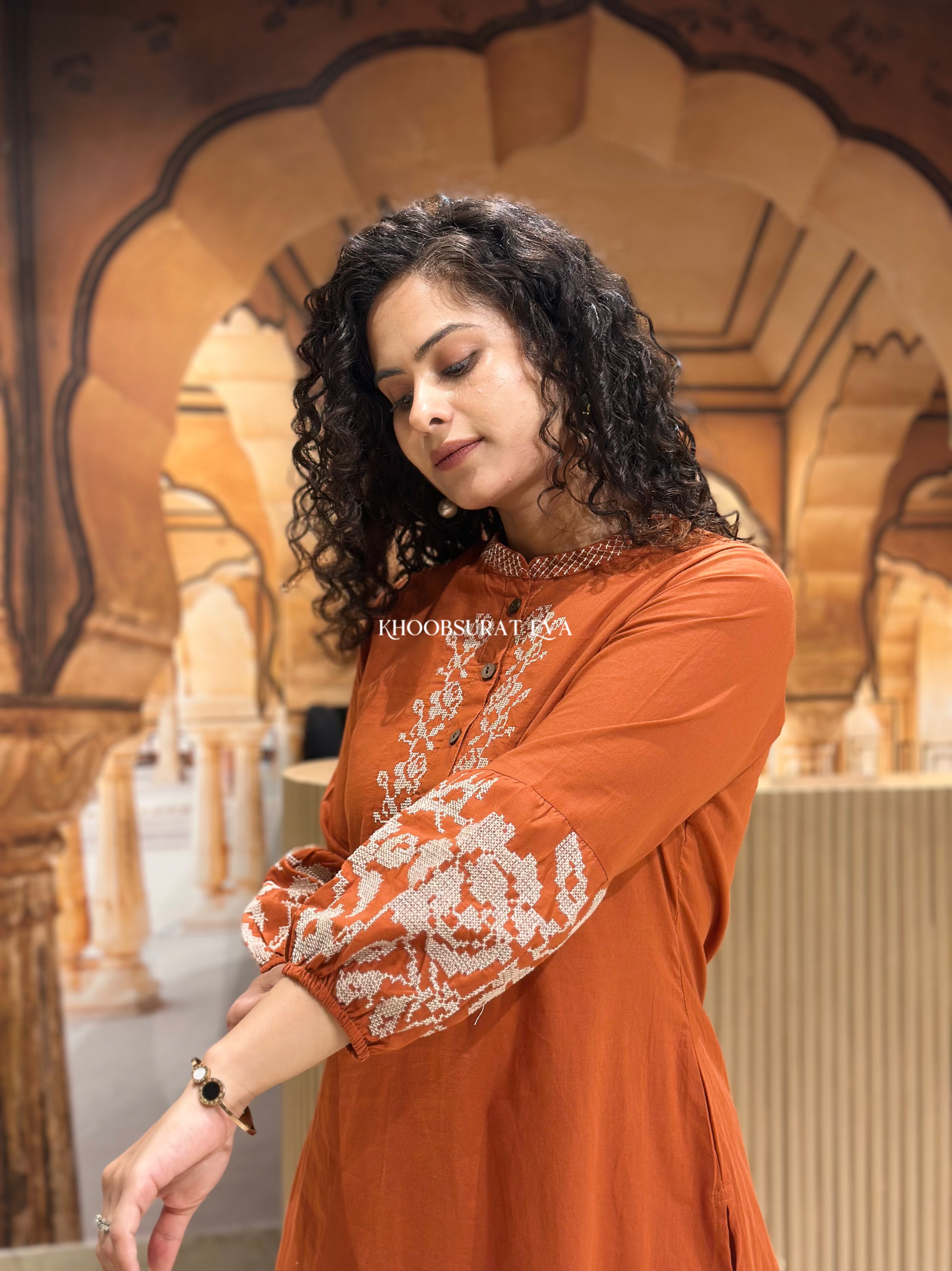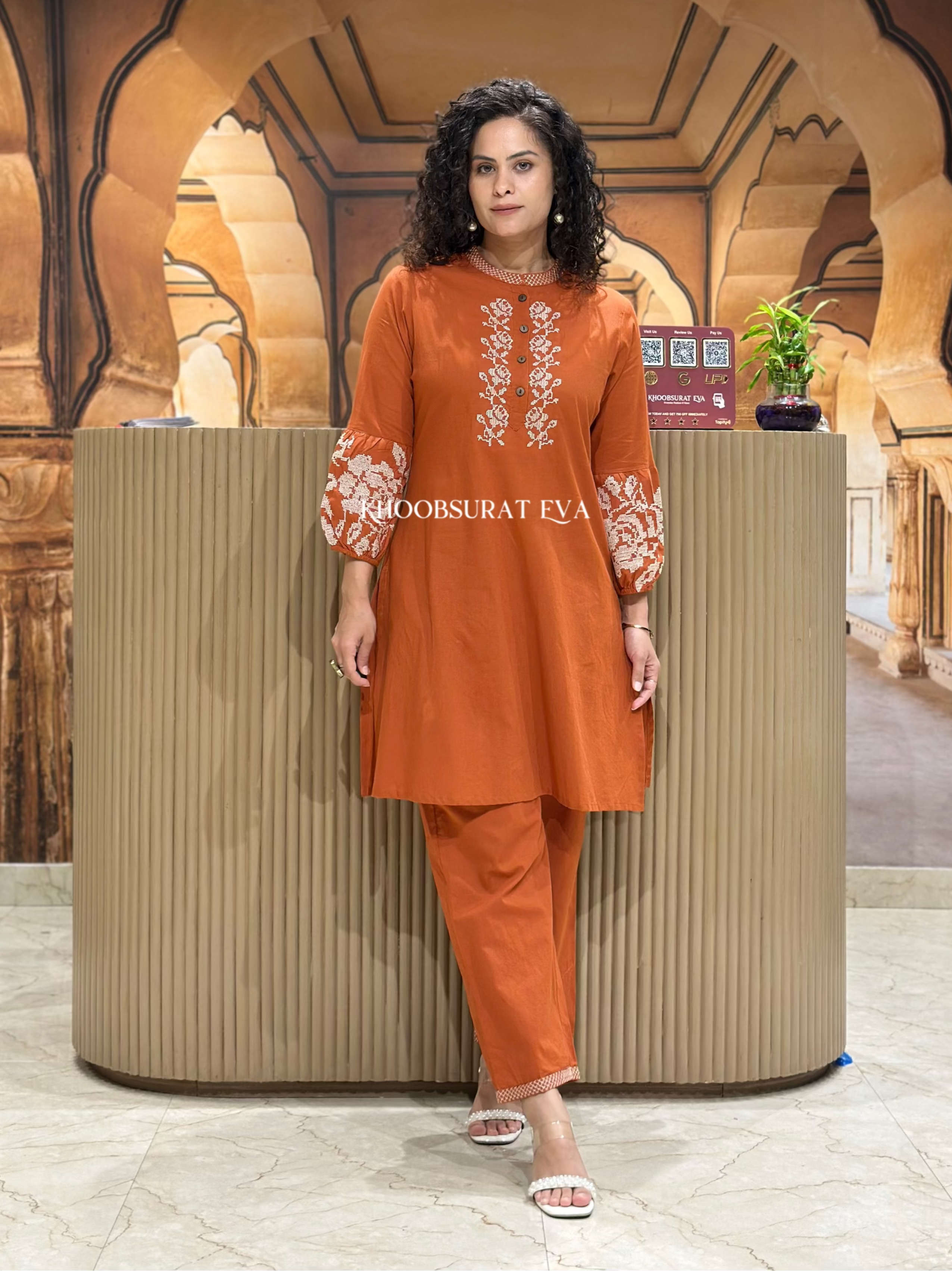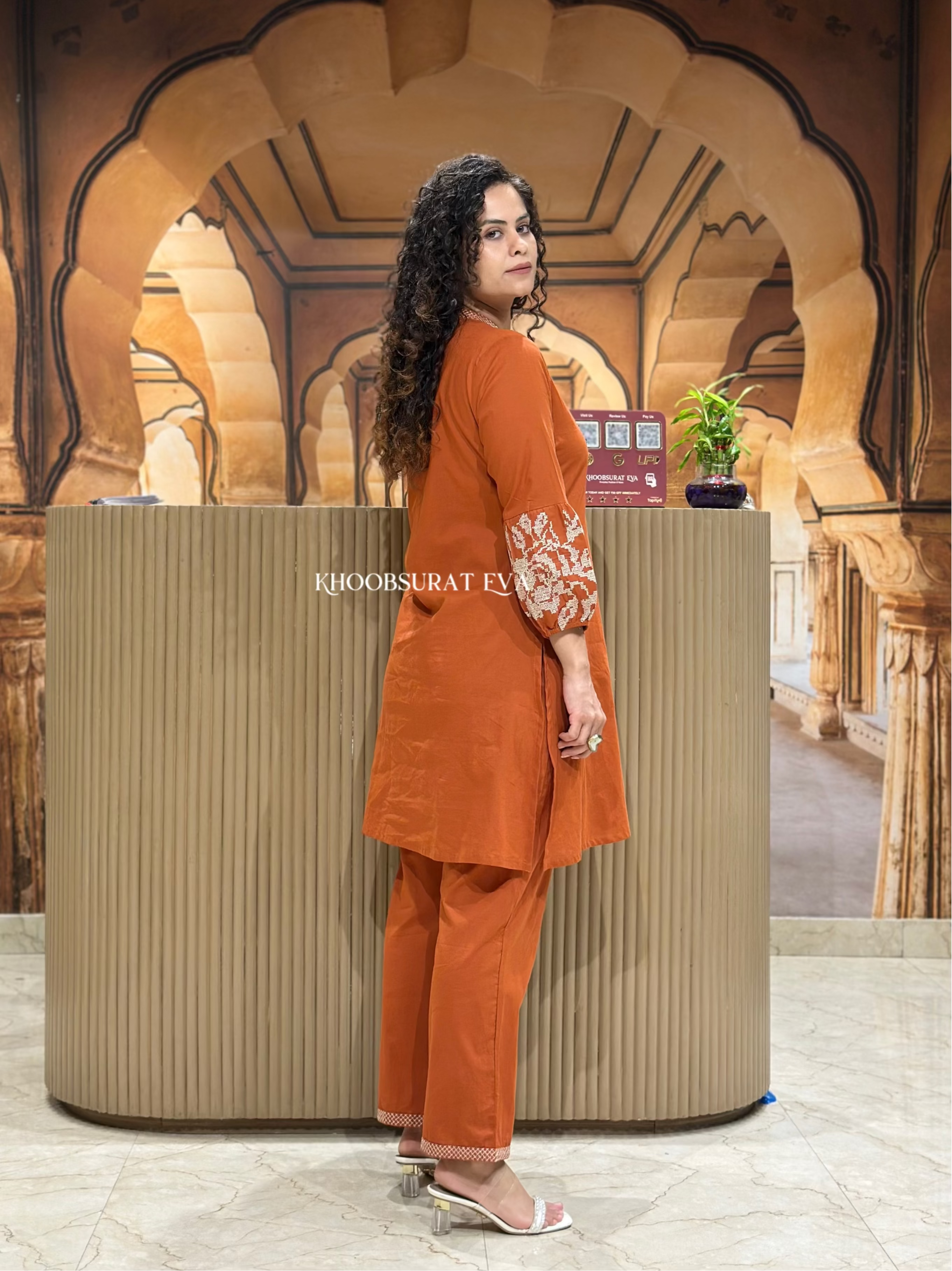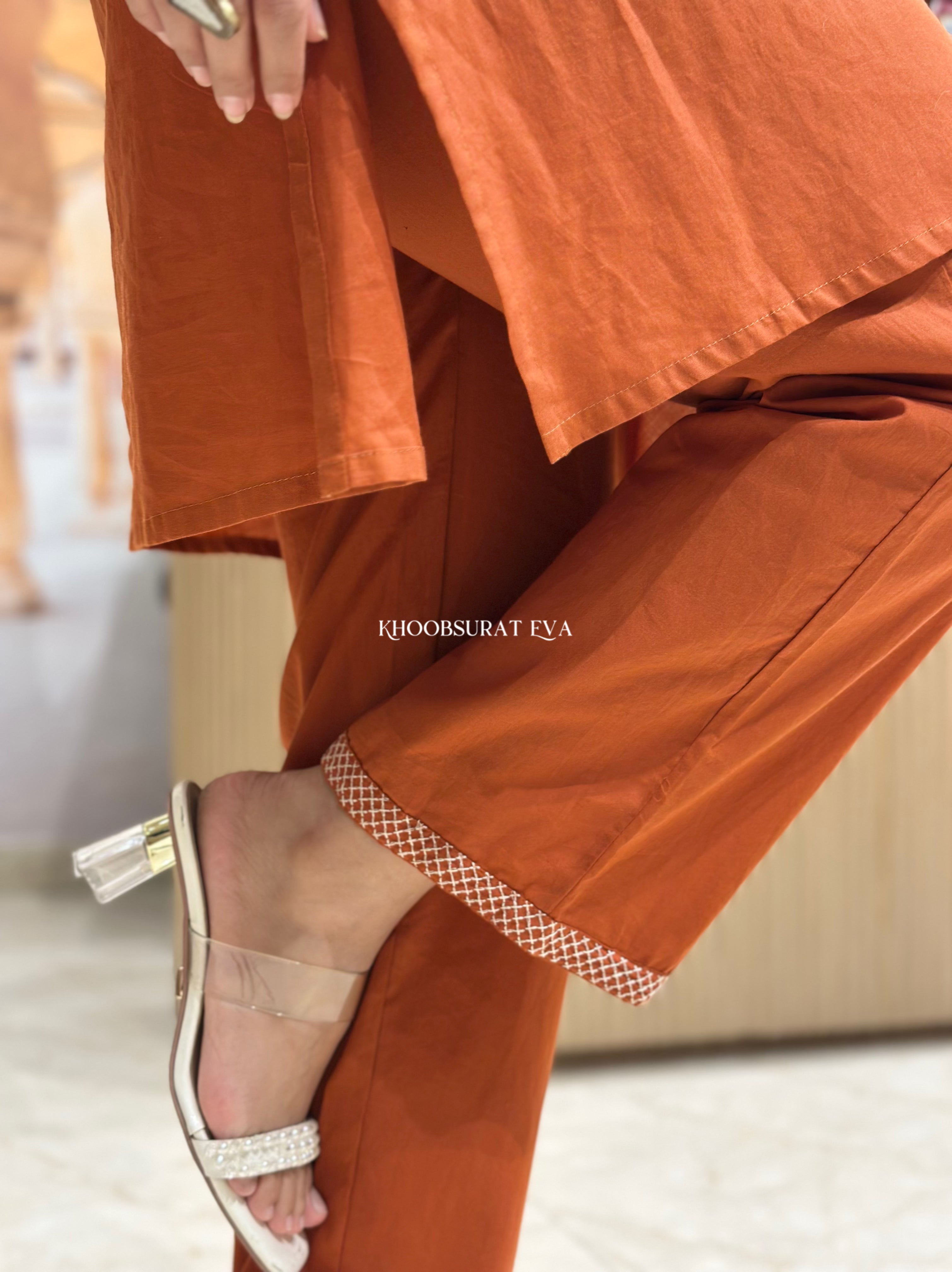 Discover the Vibe Check Rust Coord Set from Khoobsurat Eva.A beautiful ensemble designed with every body in mind. Crafted from lightweight Cotton, this set features a Top with elegant 3/4 sleeves and a stylish mandarin neck. It's perfectly paired with comfortable printed muslin trousers. Experience the harmonious blend of artistry and a modern straight silhouette. This breezy and casual coord set is your ideal choice for staying stylish and comfortable on warm days or during a hectic workday.